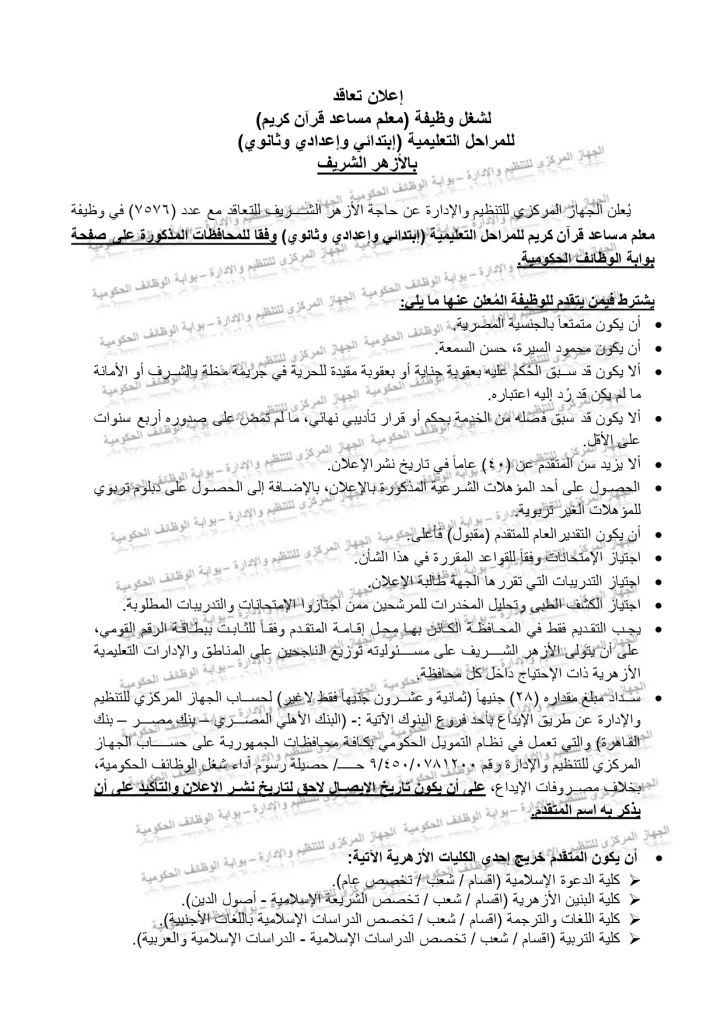 - معلم مساعد قرآن كريم: أعلن الجهاز المركزي للتنظيم والإدارة عن فتح باب التقديم لـ 7576 وظيفة معلم مساعد قرآن كريم، للعمل في المراحل التعليمية المختلفة (ابتدائي، إعدادي، ثانوي). مدة التقديم من 14 حتى 27 سبتمبر 2025 عبر بوابة الوظائف الحكومية الرسمية.