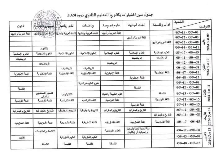 جدول سير البكالوريا 2024 لكل الشعب في الجزائر
