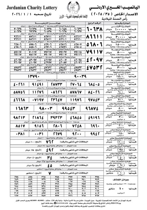 نتائج اليانصيب الخيري في الأردن الإصدار الخاص برأس السنة الميلادية والذي جرى يوم الخميس 1 يناير/ كانون الثاني 2026.