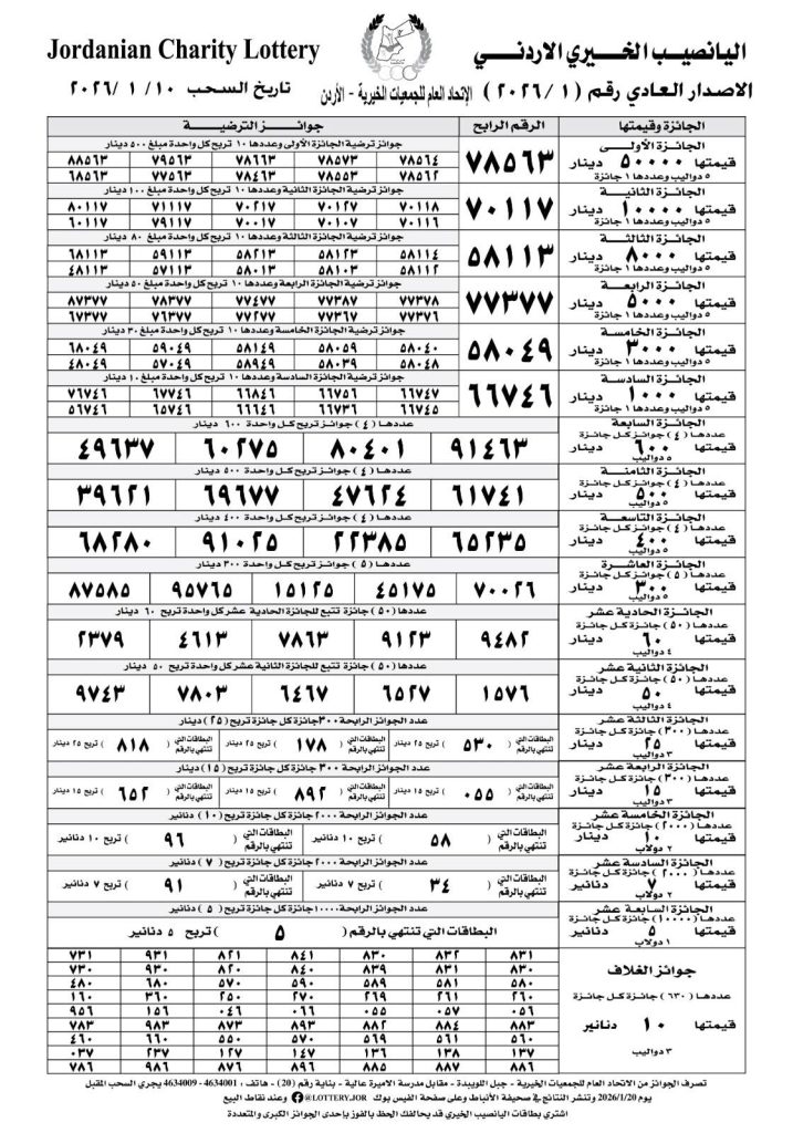 - تنشر النتائج الرسمية في اليوم التالي للسحب في الصحف الرسمية في الأردن، مع تفاصيل الجوائز من 80 دينار إلى الجائزة الكبرى.