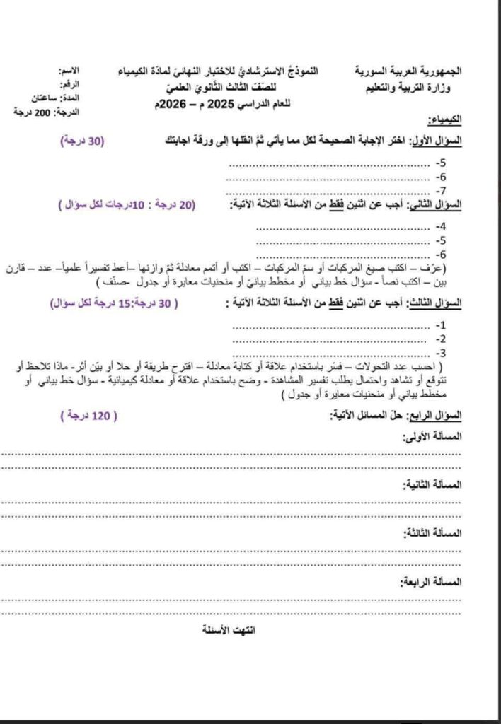 أعلنت وزارة التربية والتعليم في سورية عن النموذج الامتحاني الاسترشادي الوزاري لإمتحان مادة الكيمياء لطلاب الثانوية العامة للعام الدراسي 2025 2026.