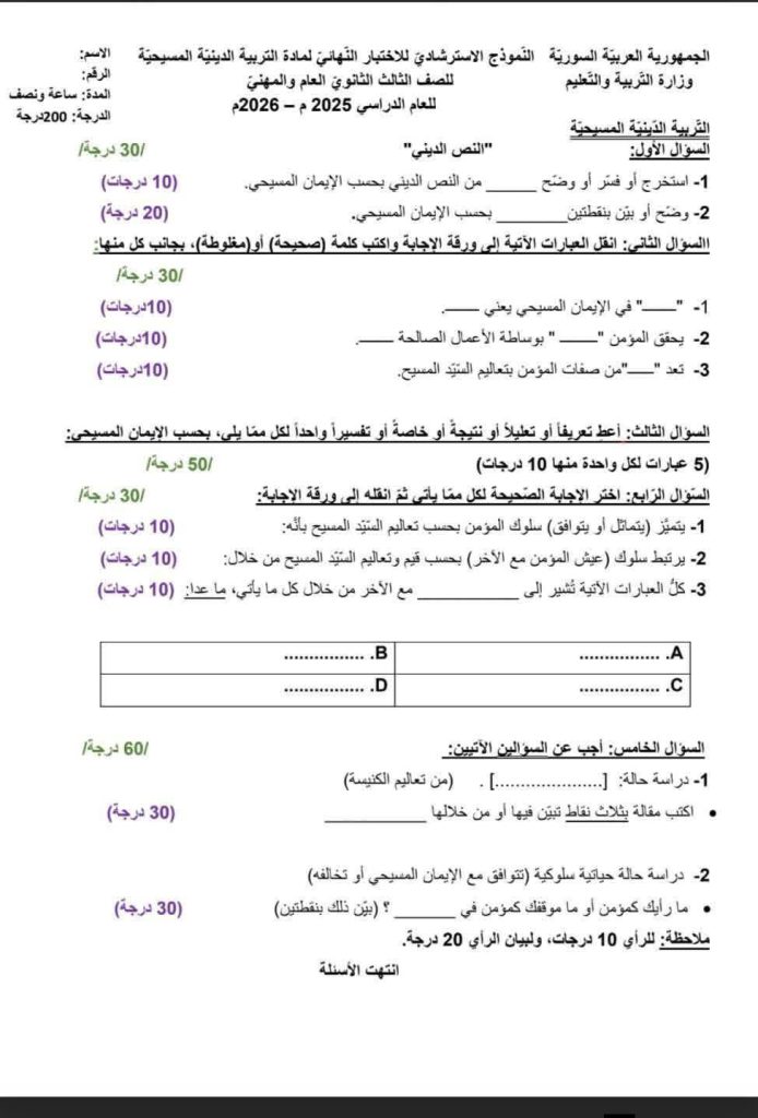 أعلنت وزارة التربية والتعليم في سوريا عن النموذج الامتحاني الاسترشادي الوزاري لإمتحان الديانة المسيحية العلمي والادبي لطلاب الثانوية العامة البكلوريا للعام الدراسي 2025 2026.