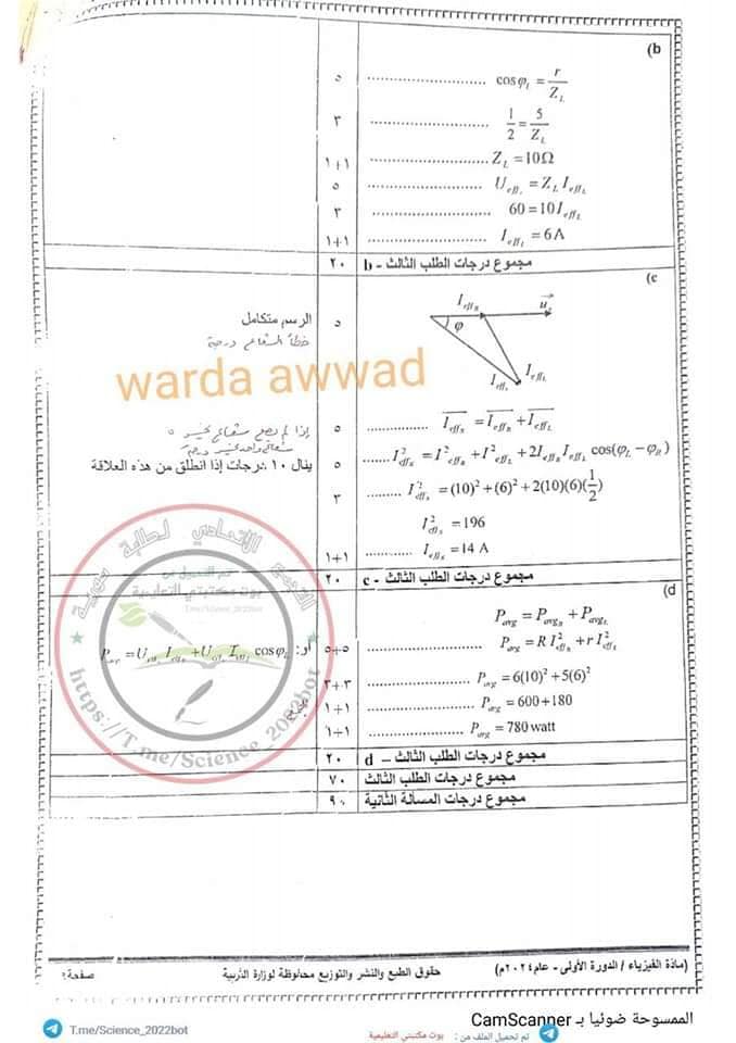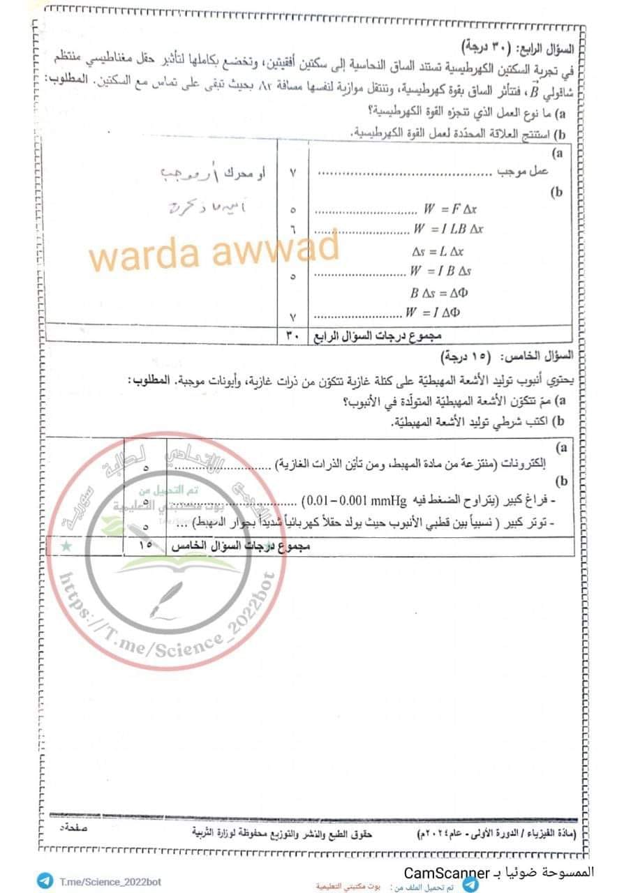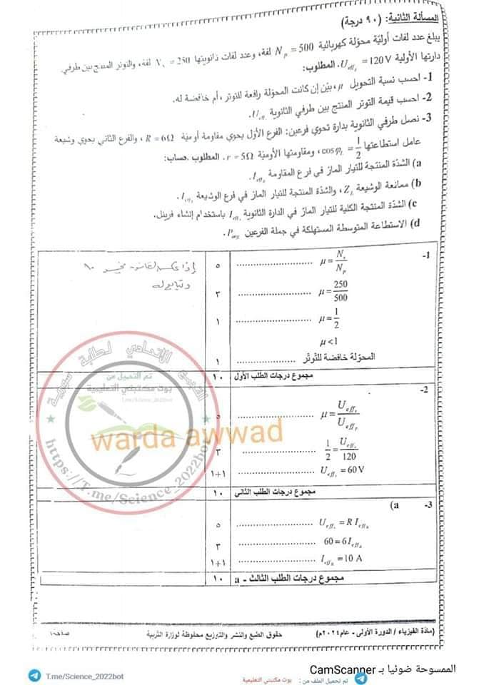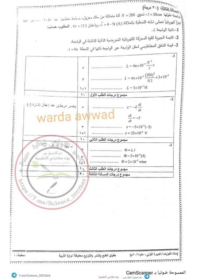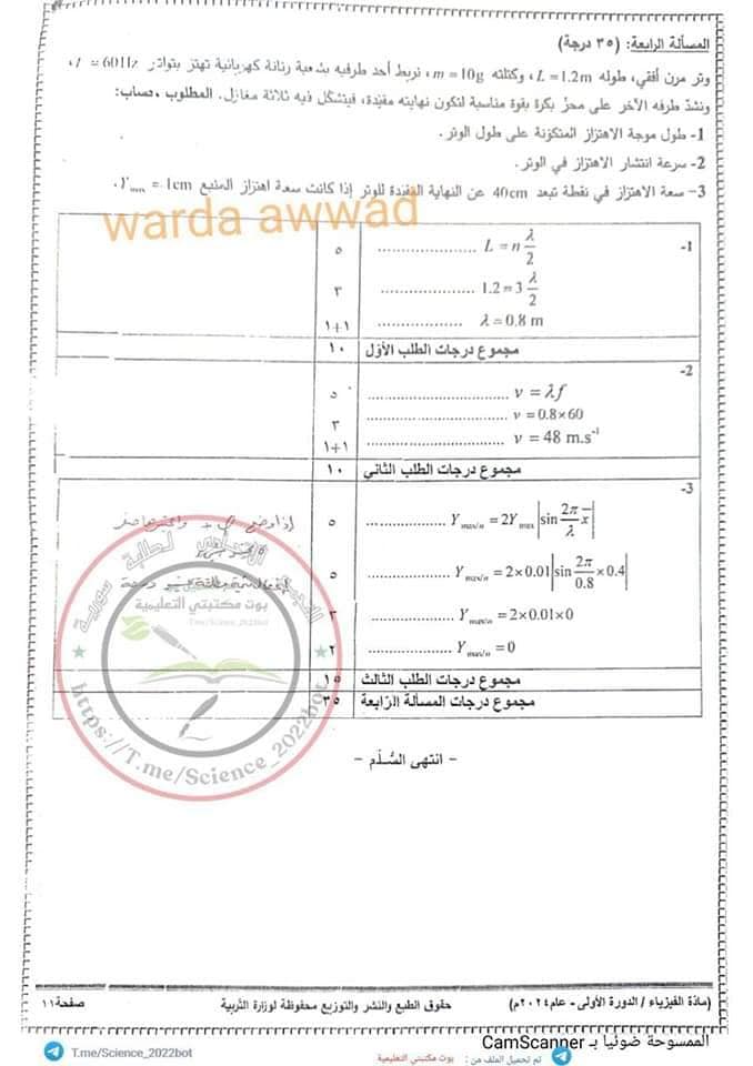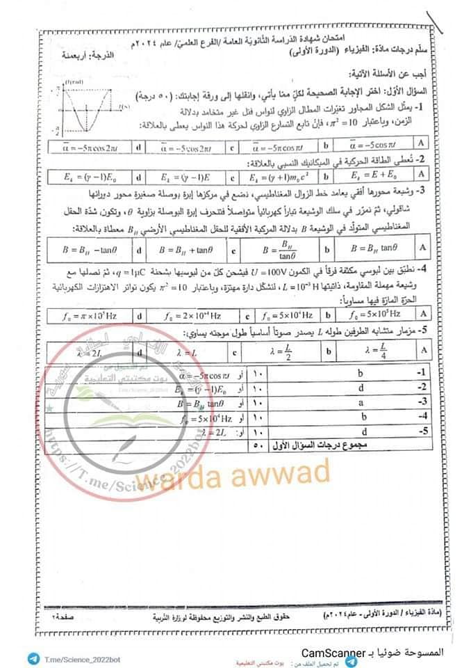سلم تصحيح مادة الفيزياء ثانوية عامة 2024 دورة أولى في سوريا