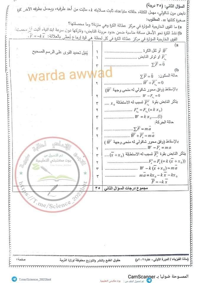سلم تصحيح الفيزياء 2024 الثانوية العامة