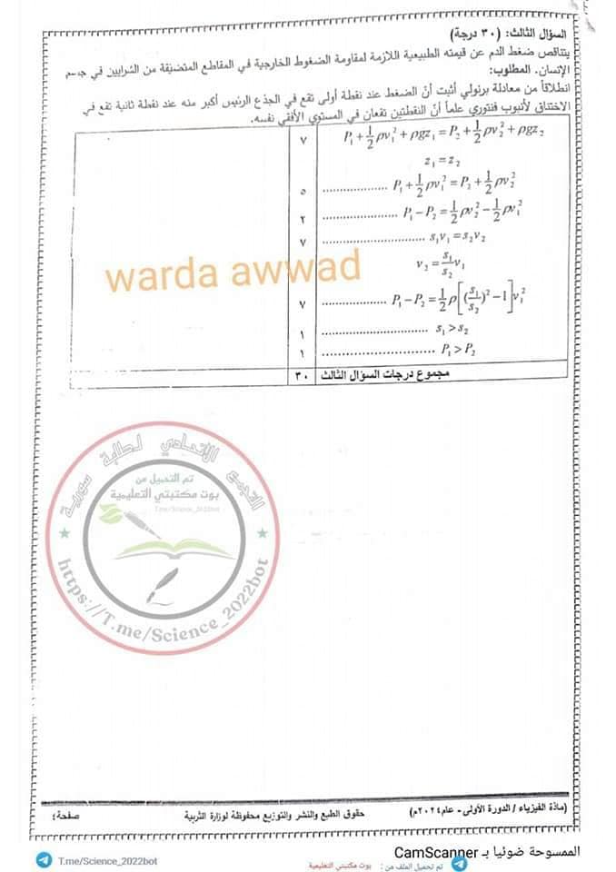 سلم تصحيح فيزياء مناسب لكل مهارات الإجابة على الأسئلة ومراعياً لمستويات الطلاب وشاملاً للحالات التي يمكن للطالب أن يجيب عليها، مبيناً في حال قام الطالب بحل المسألة بطرق غير واردة في السلم يتم عرضها على ممثل الفرع ومن ثم مناقشتها مع الموجه الاختصاصي الأول في الوزارة لأخذ الموافقة وتعميمها على جميع المحافظات السورية.