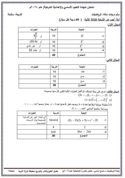 سلم تصحيح مادة الرياضيات شهادة التعليم الأساسي 2024 في سوريا