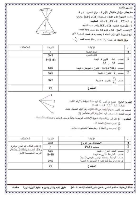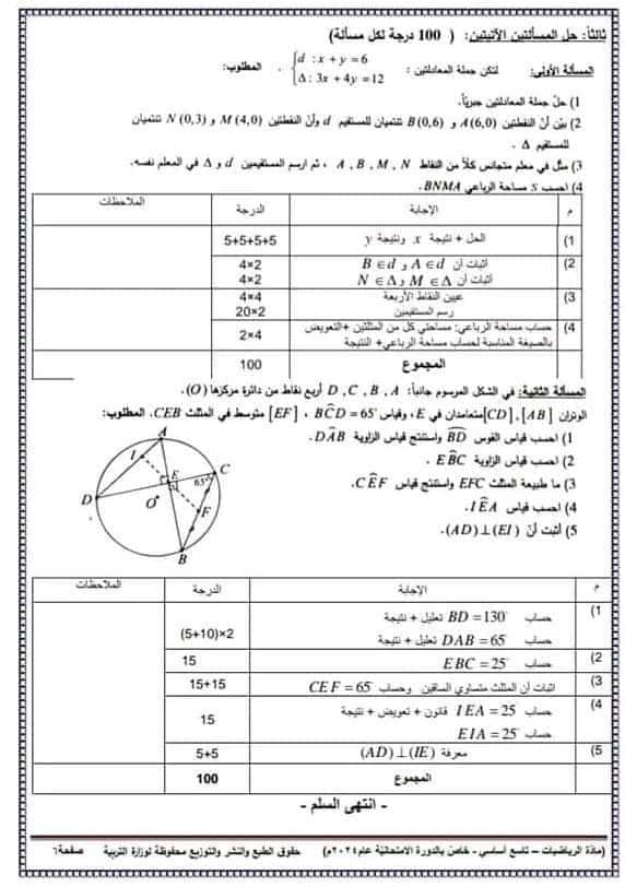سلم تصحيح الرياضيات 2024 تاسع:
