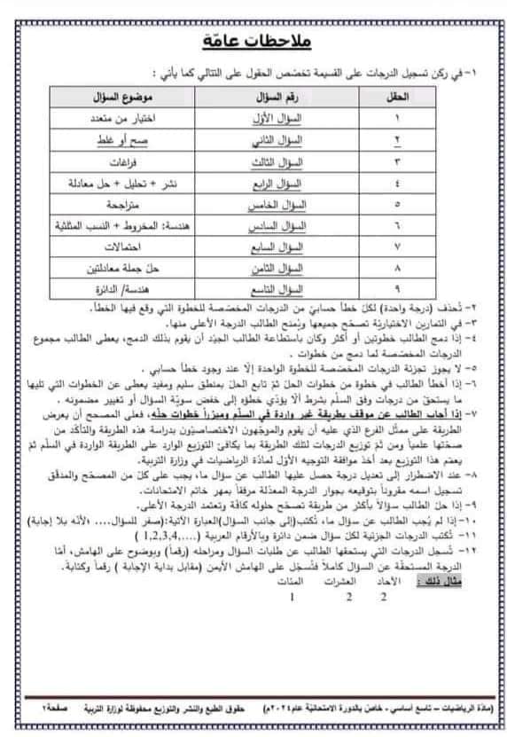 سلم تصحيح الرياضيات مناسب لكل مهارات الإجابة على الأسئلة ومراعياً لمستويات الطلاب وشاملاً للحالات التي يمكن للطالب أن يجيب عليها، مبيناً في حال قام الطالب بحل المسألة بطرق غير واردة في السلم يتم عرضها على ممثل الفرع ومن ثم مناقشتها مع الموجه الاختصاصي الأول في الوزارة لأخذ الموافقة وتعميمها على جميع المحافظات السورية.