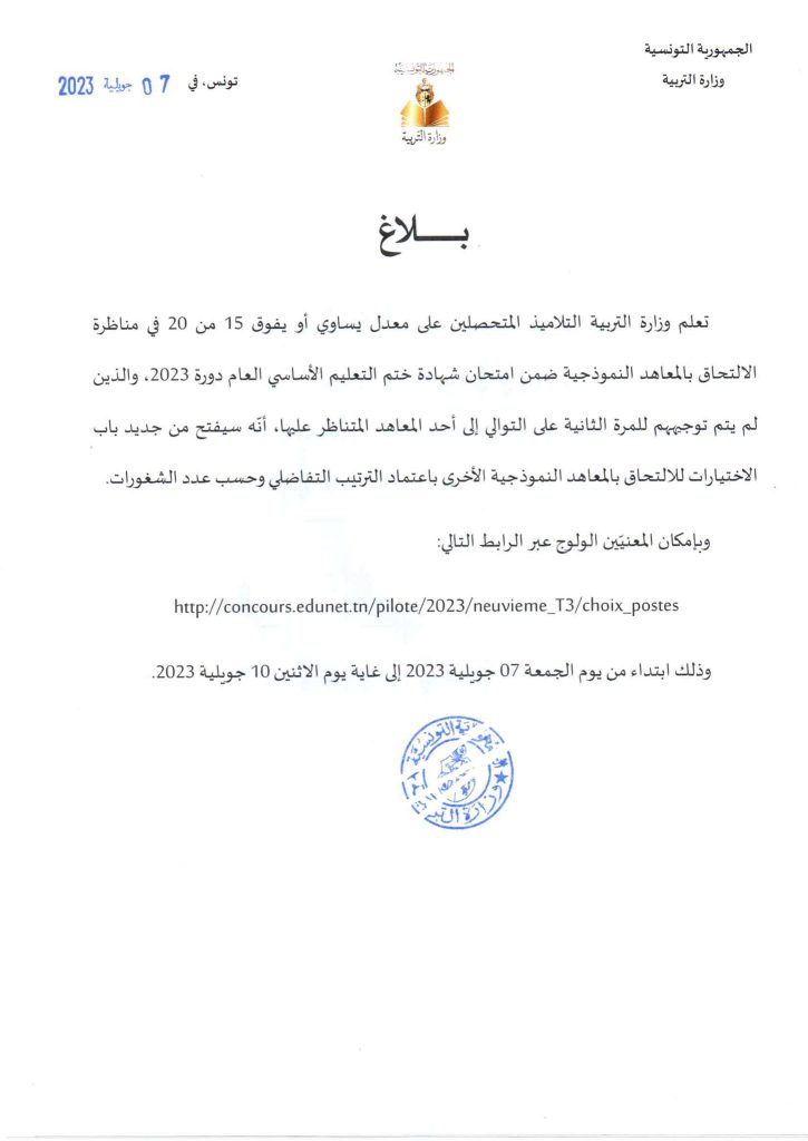 - توفي الإدارة العامة للتربية البدنية والتكوين والبحث الإدارة العامة للمرحلة الإعدادية والتعليم الثانوي القائمات النهائية للتلاميذ المقبولين في أجل أقصاه 20 أوت.