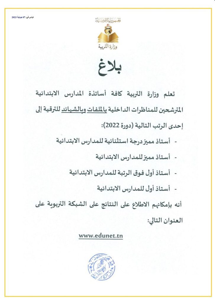 نتائج الترقية بالملفات www edunet tn ترقيات الاساتذة الابتدائي في تونس 2023