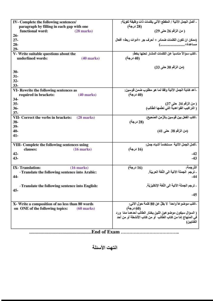 النموذج الاسترشادي يكشف للطالب الصورة الكاملة للامتحان قبل مواجهته رسمياً. في مادة الإنجليزي، يختلف توزيع الأسئلة بين القراءة، القواعد، المفردات، الترجمة، والكتابة، وكل قسم له هيكله الخاص. من خلال الاطلاع على النموذج، يتعلم الطالب مثلاً أن سؤال الترجمة يتكون عادة من خمس جمل تتطلب تطبيقاً دقيقاً للقواعد، أو أن فقرة الكتابة يجب أن تتجاوز 80 كلمة مع استخدام أدوات ربط مناسبة. هذا التعرف المسبق يلغي عنصر المفاجأة تماماً، فيدخل الطالب قاعة الامتحان وهو يعرف ما ينتظره بدقة.