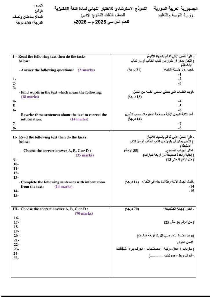 النموذج الامتحاني الوزاري لإمتحان مادة انكليزي الأدبي في سوريا لطلاب شهادة الثانوية العامة للعام الدراسي 2025 2026 وهو النموذج الرسمي المقدم من وزارة التربية والتعليم.