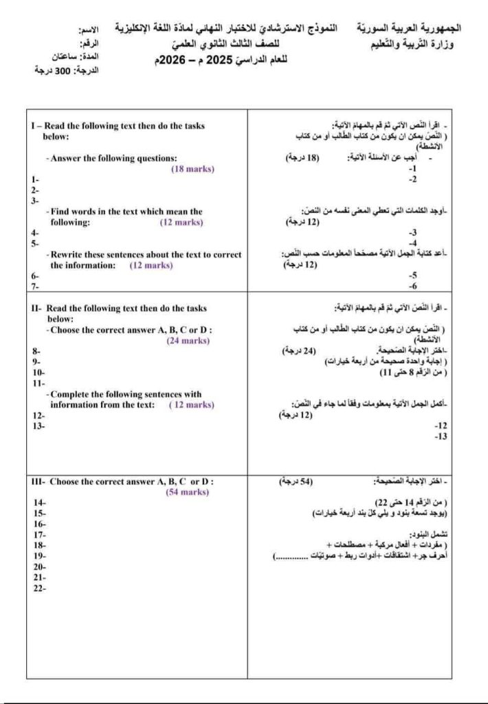 النموذج الامتحاني الاسترشادي لإمتحان مادة انكليزي علمي في سوريا لطلاب الثانوية العامة للعام الدراسي 2025 2026 وهو النموذج الرسمي المقدم من وزارة التربية والتعليم.