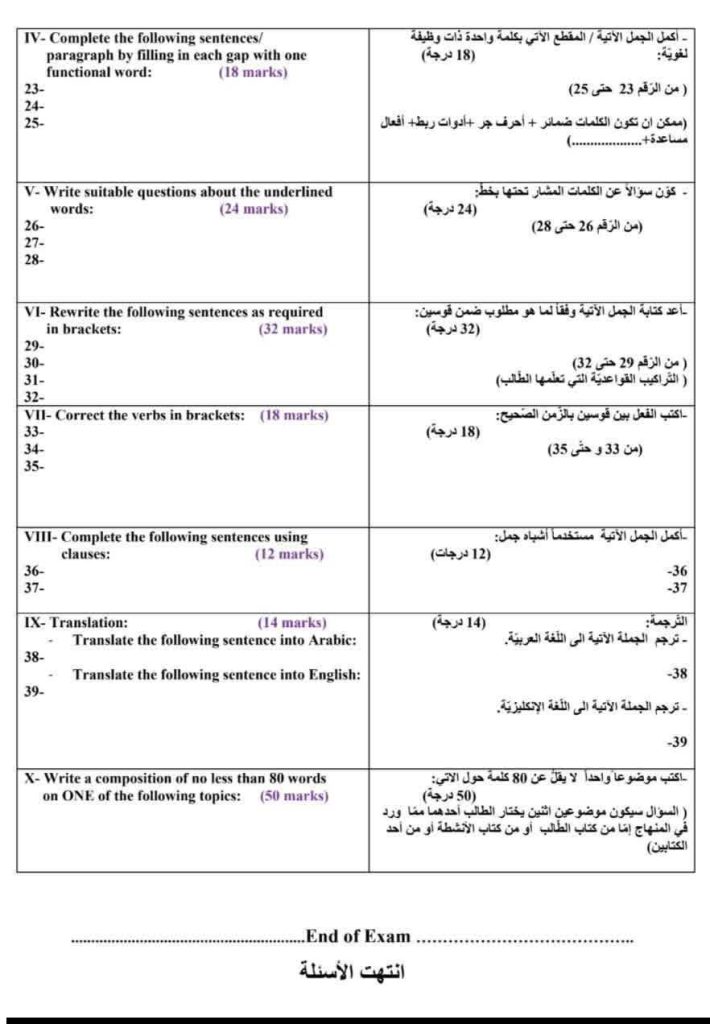 - القواعد النحوية: أسئلة تغطي الأزمنة، المبني للمجهول، الجمل الشرطية، التوابع، والكلام غير المباشر.