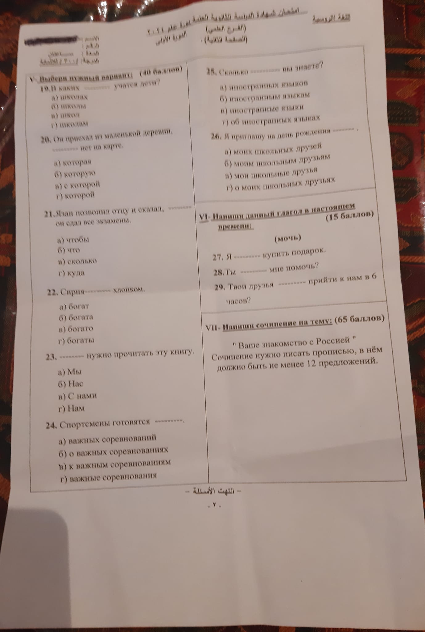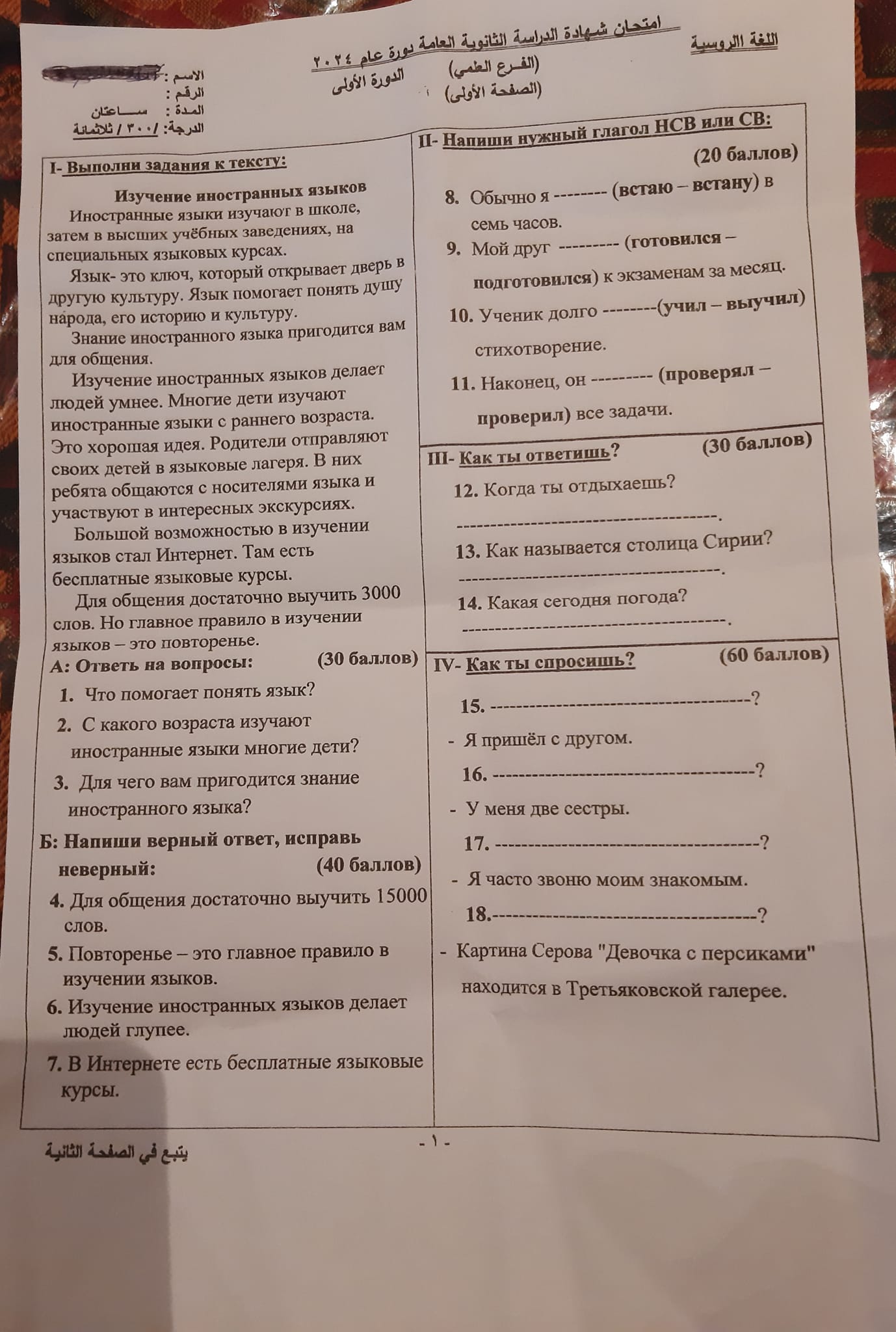 نقدم اليكم اسئلة امتحان مادة اللغة الروسية شهادة الثالث الثانوي علمي الدورة الأولى للعام الدراسي 2024 في سوريا والتي جرت يوم الثلاثاء (28 أيار 2024) مع الحل الخاص بها.