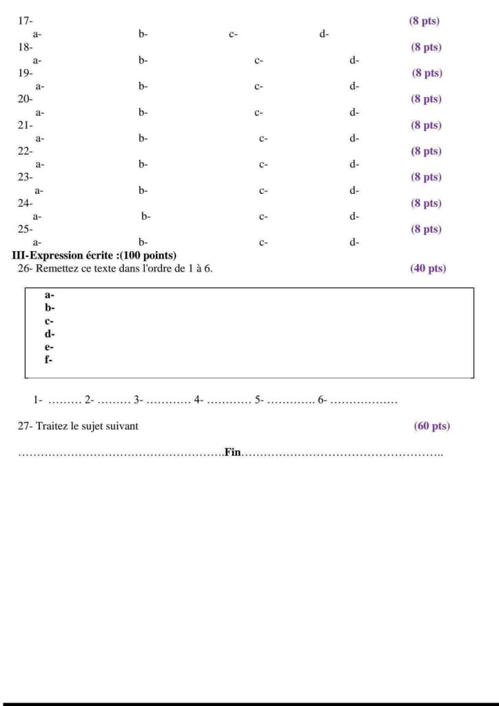 - السؤال الثالث (60 درجة): 7 جمل غير مرتبة لكتابة موضوع تعبيري (رسالة، مقالة، وصف) مع ترجمة جمل أو كلمات خارجية.