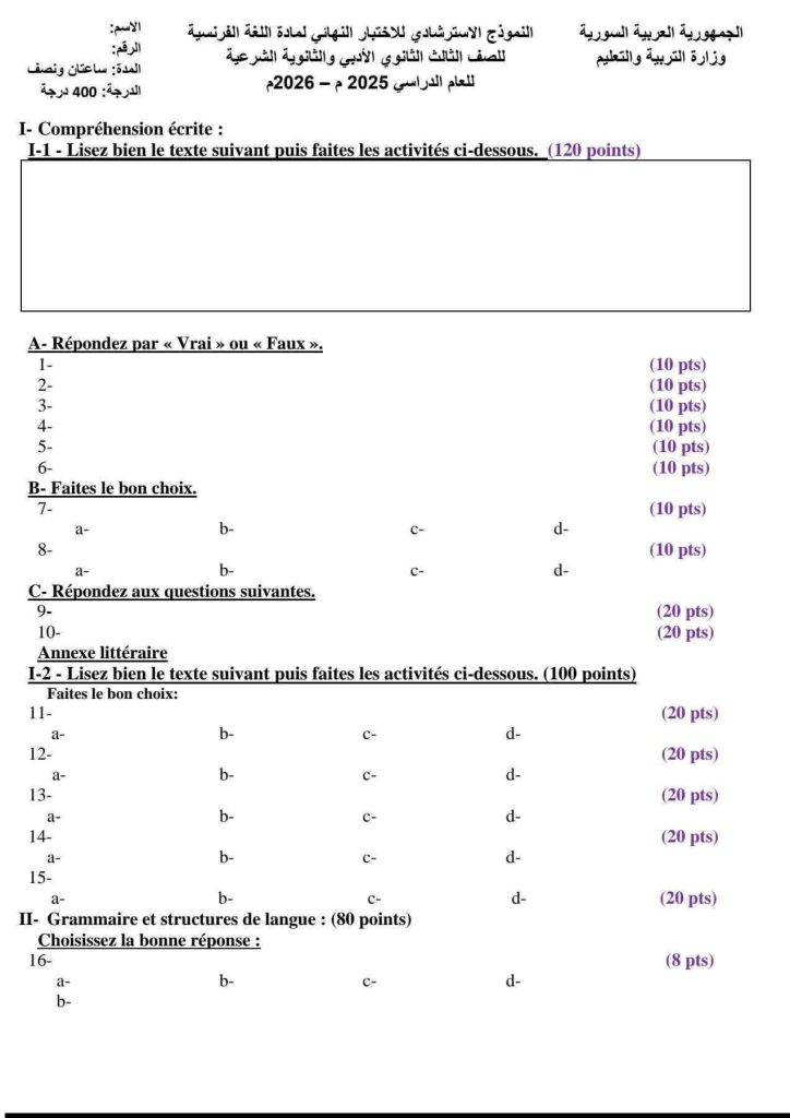 النموذج الامتحاني لإمتحان مادة الفرنسي الأدبي لطلاب شهادة الثانوية في سورية للعام الدراسي 2026 وهو النموذج الرسمي المقدم من وزارة التربية والتعليم.