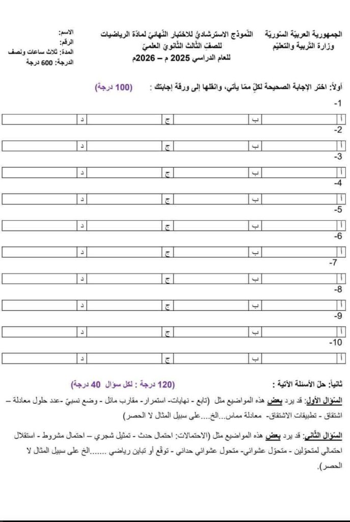 أعلنت وزارة التربية والتعليم في سوريا عن النموذج الامتحاني الاسترشادي الوزاري لإمتحان مادة الرياضيات لطلاب الثانوية العامة للعام الدراسي 2025 2026.