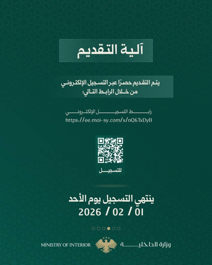 أعلنت وزارة الداخلية السورية عن فتح باب الانتساب للالتحاق بـ دورة الأفراد (ذكور)، مخصصة لصالح محافظات دير الزور، الحسكة، والرقة، وذلك وفق الشروط والضوابط المعتمدة، يمكن للراغبين بالانتساب التسجيل من خلال مسح رمز الاستجابة السريعة(QR) المرفق في المقال أو عبر الرابط الإلكتروني في الفقرة الأخيرة منه، علما ان التقديم ينتهي يوم الأحد 1 شباط 2026.