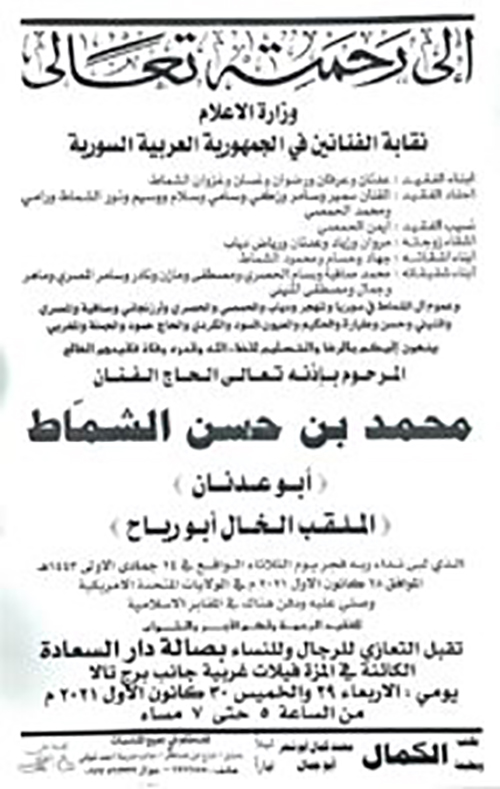 وتستقبل عائلة الفنان القدير واجب العزاء يومي الأربعاء والخميس 29 و30 كانون الثاني في دار السعادة للمسنين الكائنة في المزة من الخامسة وحتى السابعة مساءً للرجال والنساء.