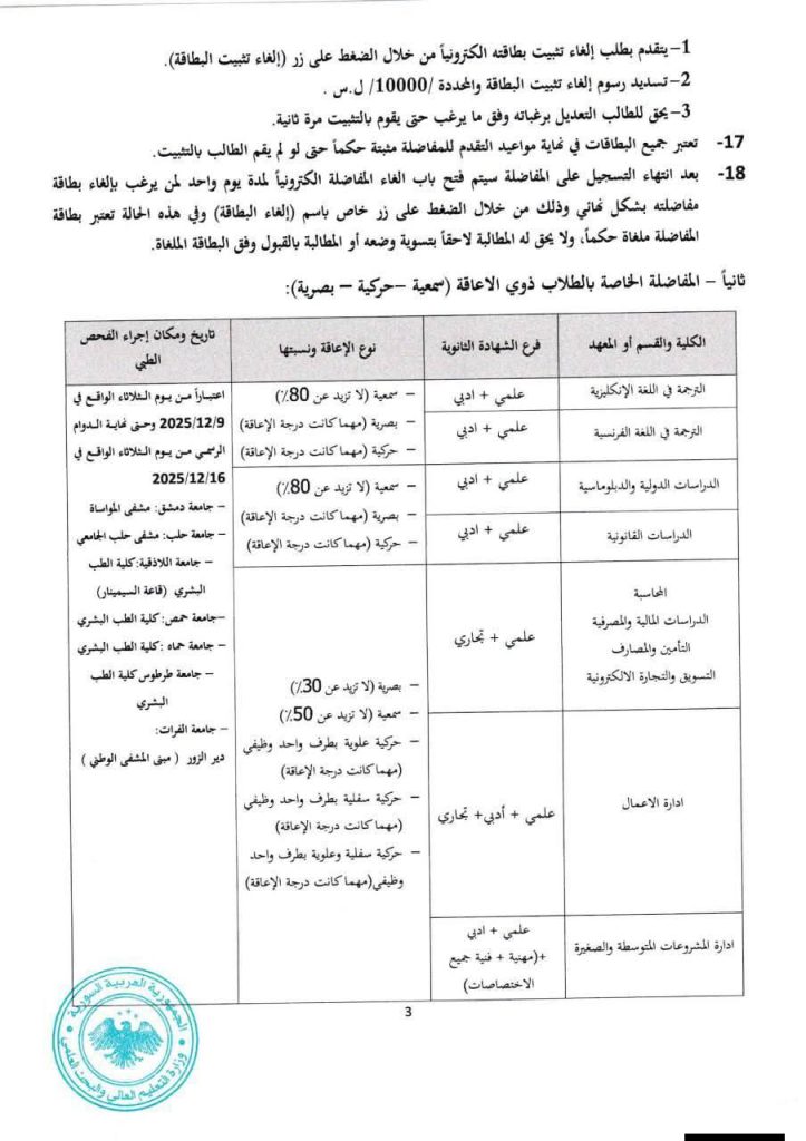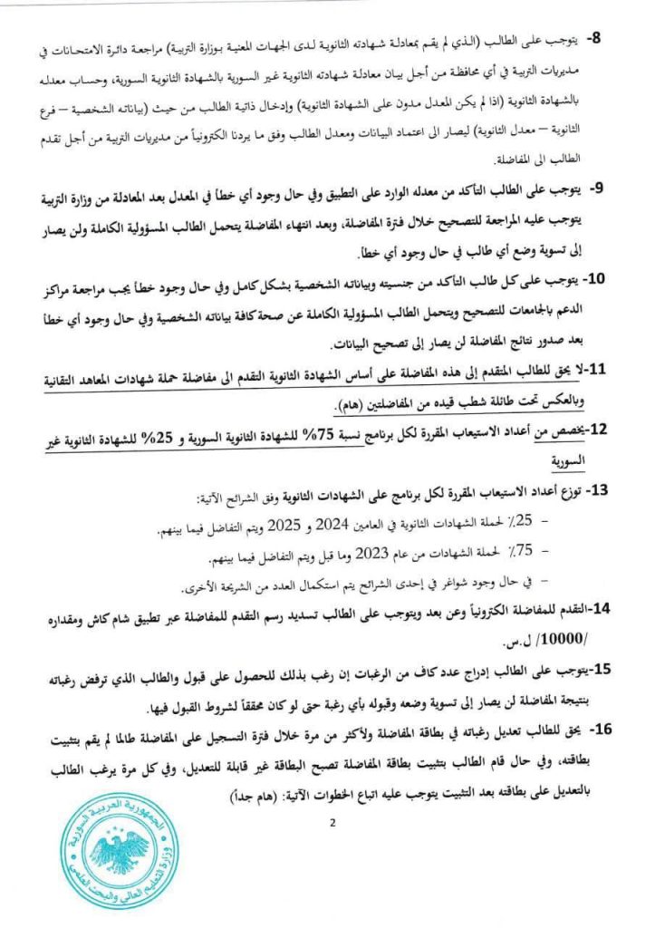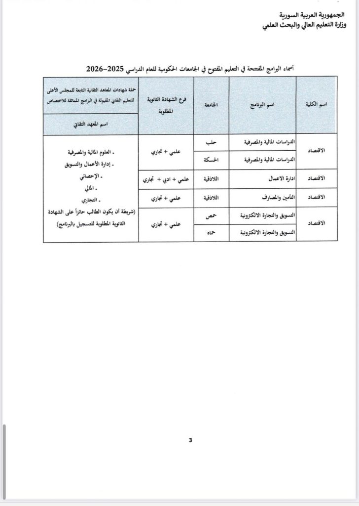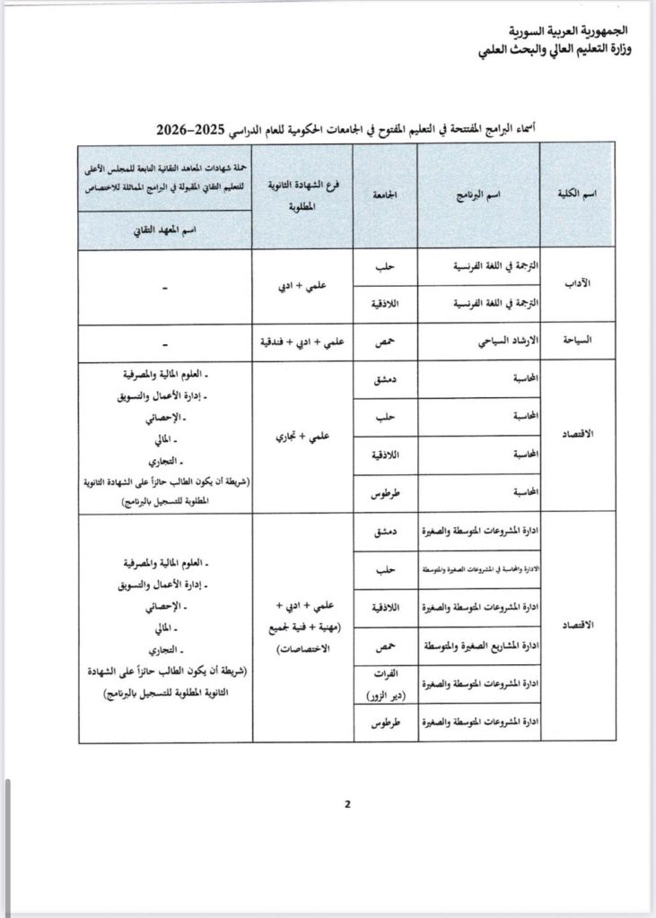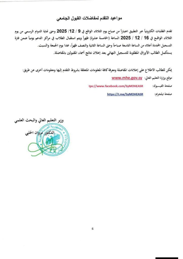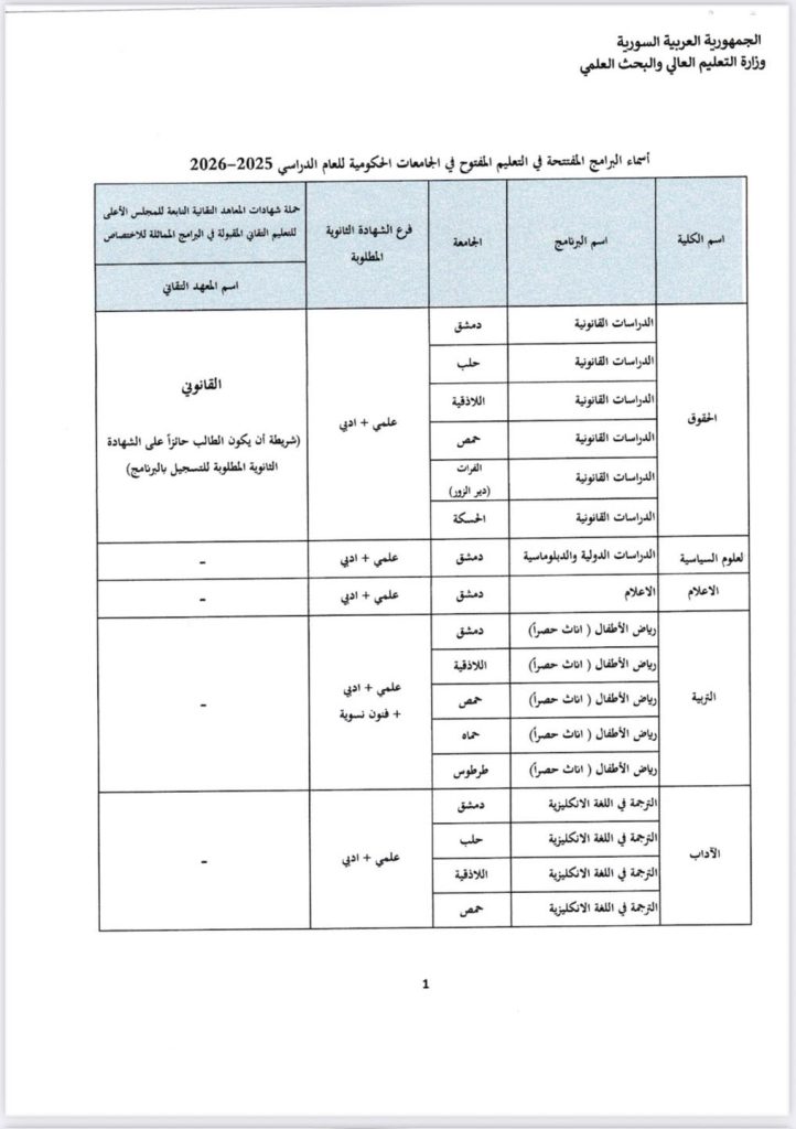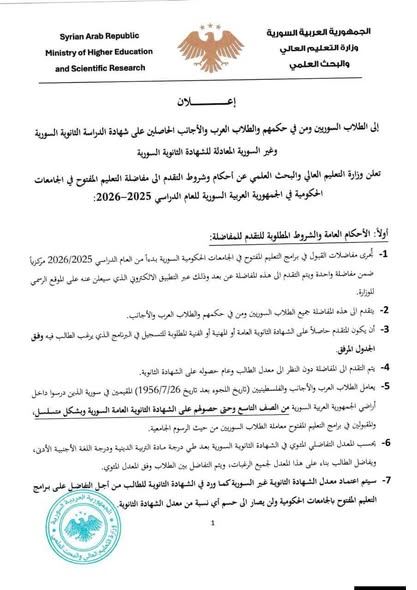 أعلنت وزارة التعليم العالي والبحث العلمي في سوريا اليوم الثلاثاء (9 كانون الأول 2025) عن إعلانات مفاضلات الجامعات المختلفة في برامج التعليم المفتوح وسنضع في الموضوع جميع المفاضلات لكل الجامعات المعلن عنها للعام الدراسي 2025 2026.