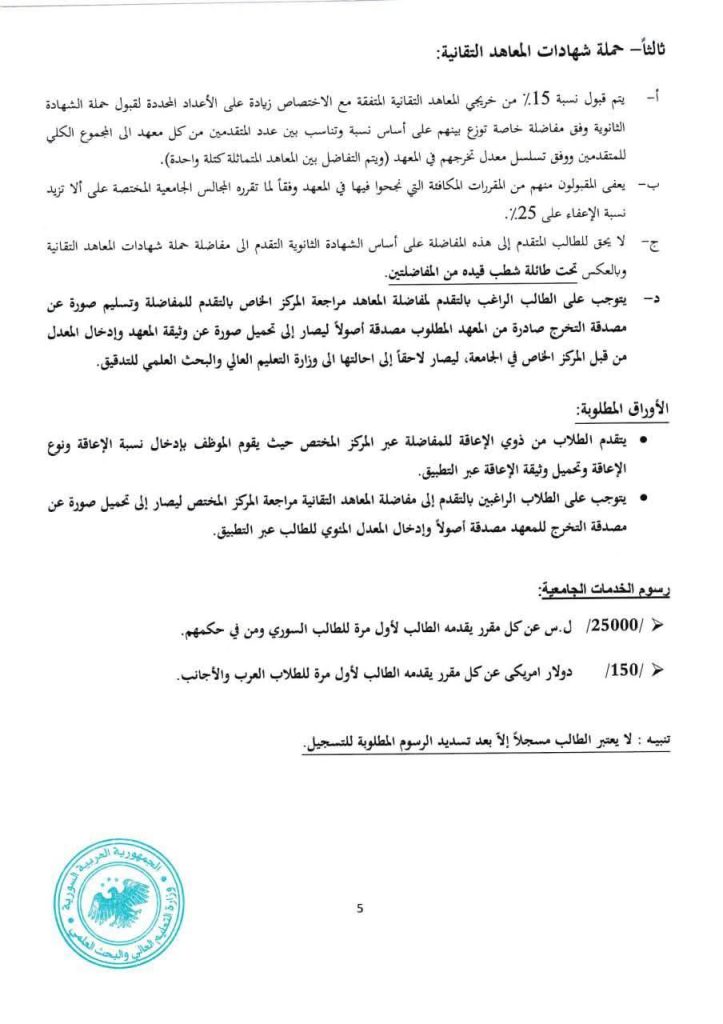 - رسوم إضافية: رسم تسجيل سنوي حوالي 37,000 ل.س في بعض الجامعات مثل اللاذقية، مع إعفاءات للطلاب السوريين غير المقيمين أو الأجانب (150 دولار للمادة).