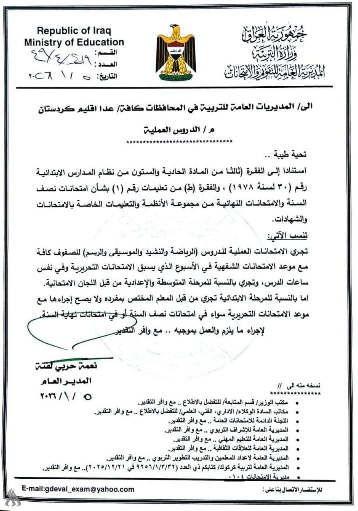 أعلنت وزارة التربية في العراق يوم الاثنين (6 يناير 2026) عن مواعيد الامتحانات العملية للمراحل الدراسية كافة: (الرياضة، النشيد، الموسيقى، والرسم) قبل أسبوع من بدء الامتحانات التحريرية، وحسب ساعات الدروس المقررة.