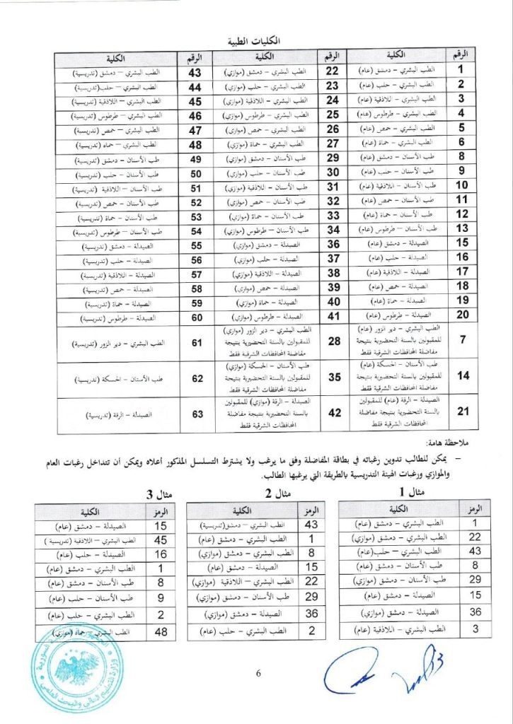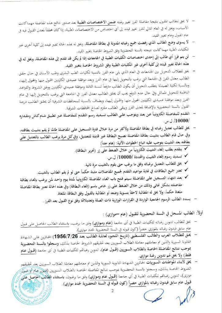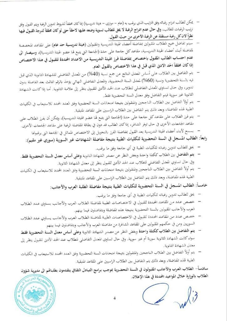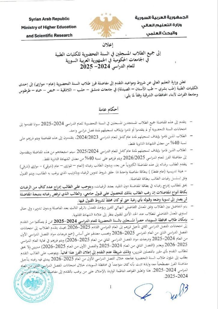 تطبق هذه السنة في الجامعات الحكومية السورية وتتضمن آليات محددة للقبول والفرز والتوزيع، مع اهتمام خاص للطلاب العرب والأجانب المقيمين في سوريا. كما تستمر الوزارة في تطوير البرنامج لمواكبة المتطلبات التعليمية الحديثة وضمان جودة التعليم الطبي.