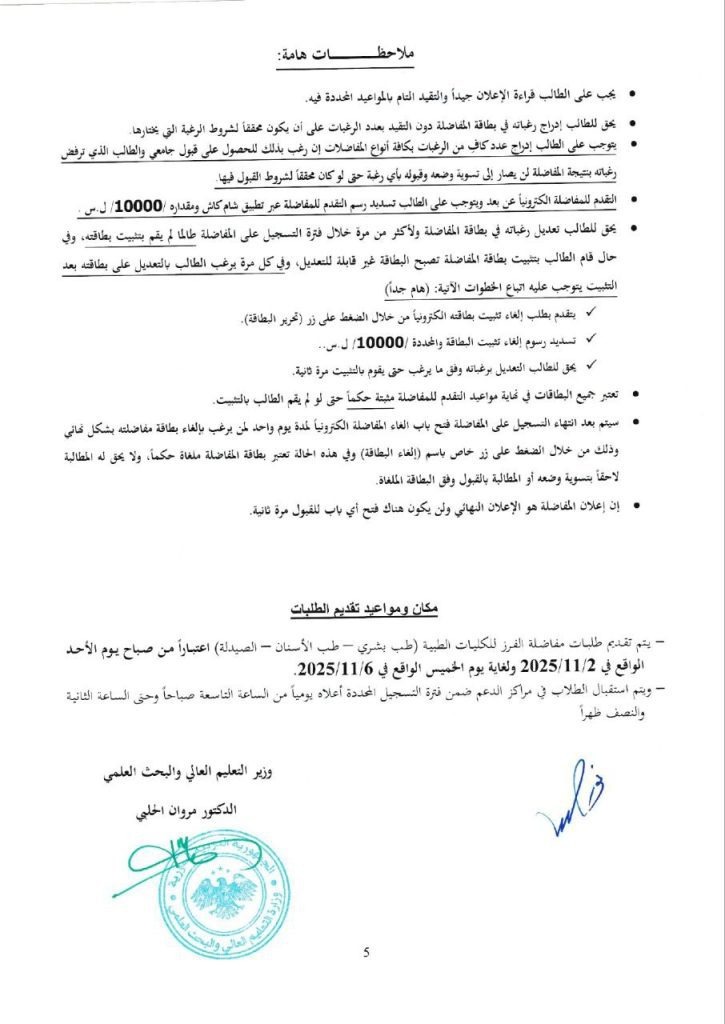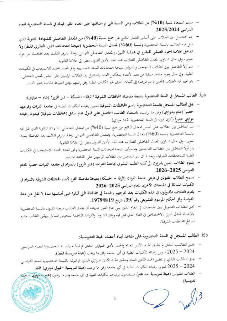 تفاصيل الإعلان تشمل أيضًا تعليمات حول التأجيل واستخراج الوثائق المطلوبة لتحقيق القبول النهائي، إضافة إلى توضيحات خاصة بالطلاب العرب والأجانب المقيمين في سوريا. الإعلان يضمن تنظيم العملية الانتقالية من السنة التحضيرية إلى الدراسة الجامعية بشكل منتظم وشفاف.