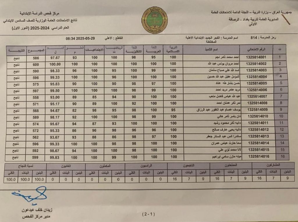 نتائج مدرسة الفجر رصافة 1:
