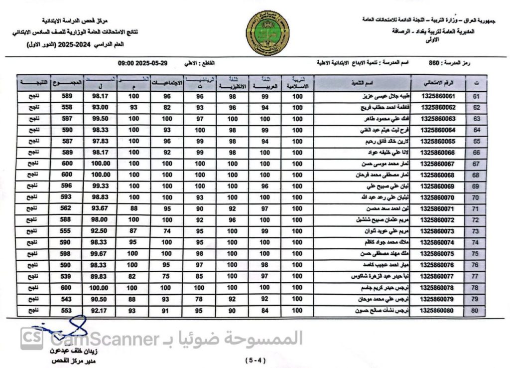 نتيجة الشهادة الابتدائية في الرصافة الاولى دور أول