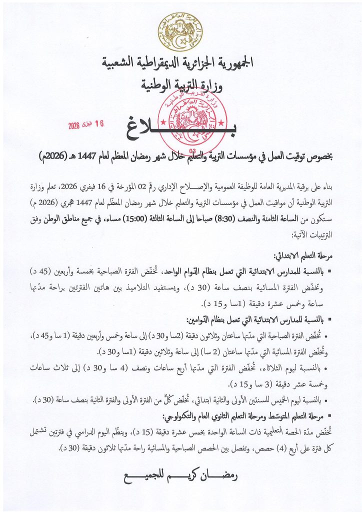 أصدرت وزارة التربية والتعليم في الجزائر بلاغا أوضحت فيه توقيت العمل في مؤسسات التربية والتعليم خلال شهر رمضان المعظم لعام 1447 هجري الموافق 2026 ميلادي.