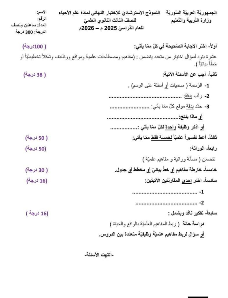 النموذج الامتحاني لإمتحان مادة العلوم لطلاب البكالوريا في سوريا لعام 2026 وهو النموذج الرسمي المقدم من وزارة التربية والتعليم.