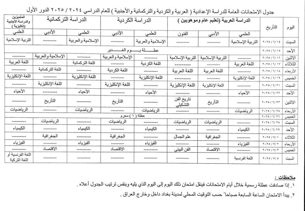 أعلنت وزارة التربية في العراق عن جدول الامتحانات الوزارية للشهادة الإعدادية الصف السادس الاعدادي الدور الاول بكافة فروعه العلمي والادبي والفنون للدراسات العربية والكردية والتركمانية والمتميزين للعام الدراسي 2024 2025.
