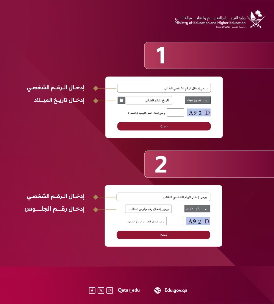 - يمكن الاستعلام عبر موقع وزارة التعليم والتعليم العالي (edu.gov.qa) أو بوابة معارف باستخدام رقم الجلوس/الهوية بعد الساعة 12 ظهرًا ، وتجدون روابط النتيجة في نهاية هذا المقال.