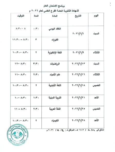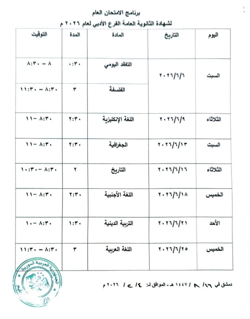 أصدرت وزارة التربية والتعليم في سوريا برنامج امتحان شهادتي الثانوية العامة بفرعيها العلمي والأدبي والثانوية الشرعية للعام الدراسي 2026.
