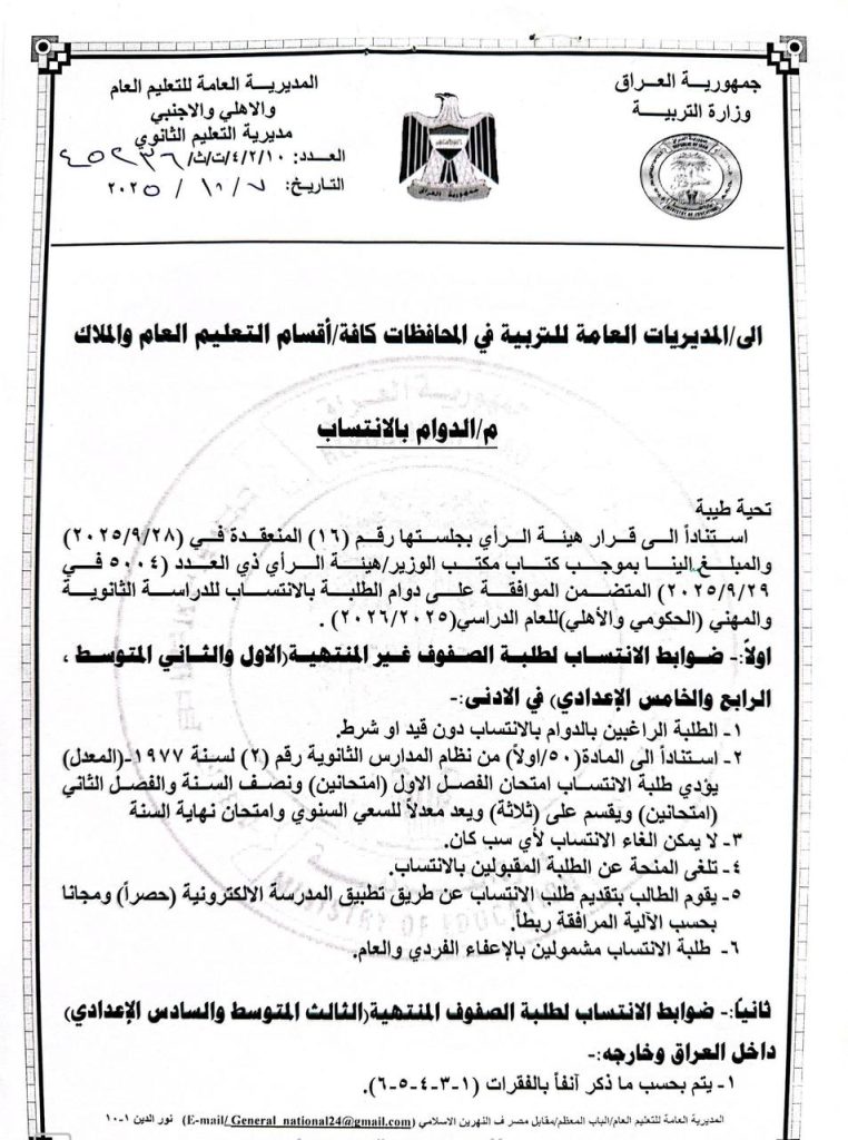 نظام الانتساب في المراحل الثانوية في العراق للعام الدراسي 2026 له ضوابط خاصة أعلنتها وزارة التربية العراقية، ويمكن تلخيصها كالتالي: