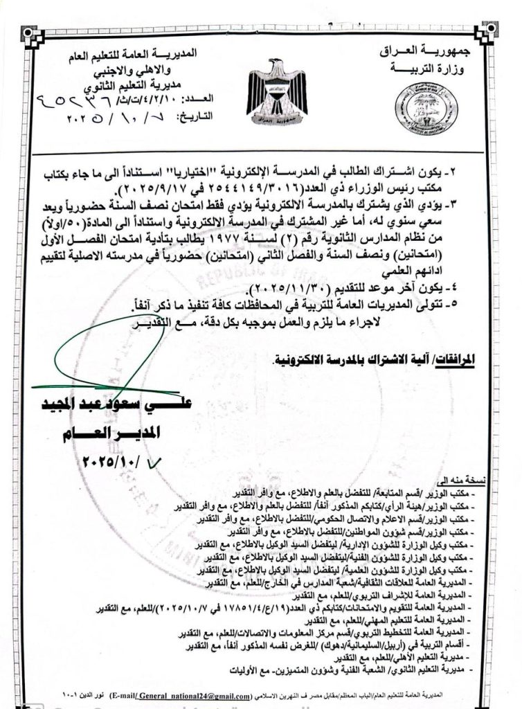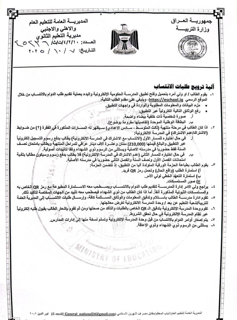 هذا النظام يساعد في إتاحة فرص التعلم عن بعد للطلاب الذين يرغبون في ذلك مع الالتزام بأداء امتحاناتهم حضورياً بطريقة منظمة.نظام الانتساب في المراحل الثانوية في العراق للعام الدراسي 2025-2026 يتضمن ضوابط واضحة من وزارة التربية العراقية، حيث يُسمح للطلاب بالمشاركة طوعياً في المدرسة الإلكترونية، يؤدون امتحاني نصف السنة واخر السنة حضورياً في مدارسهم الأصلية، مع إعفائهم من الامتحانات الفصلية الأخرى.