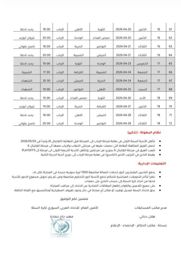 جدول مباريات مرحلة الإياب من الدوري السوري لكرة السلة 2026