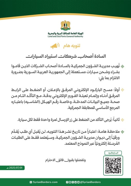 تُهيب مديرية الشؤون الجمركية بالسادة أصحاب الشركات الذين قاموا بشراء وشحن سيارات مستعملة إلى الجمهورية العربية السورية بضرورة الالتزام بما يلي: